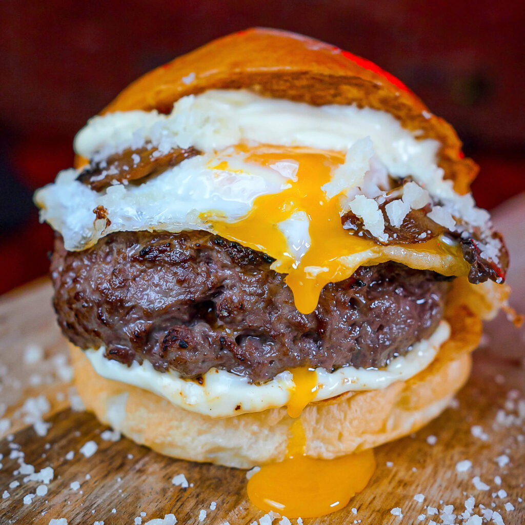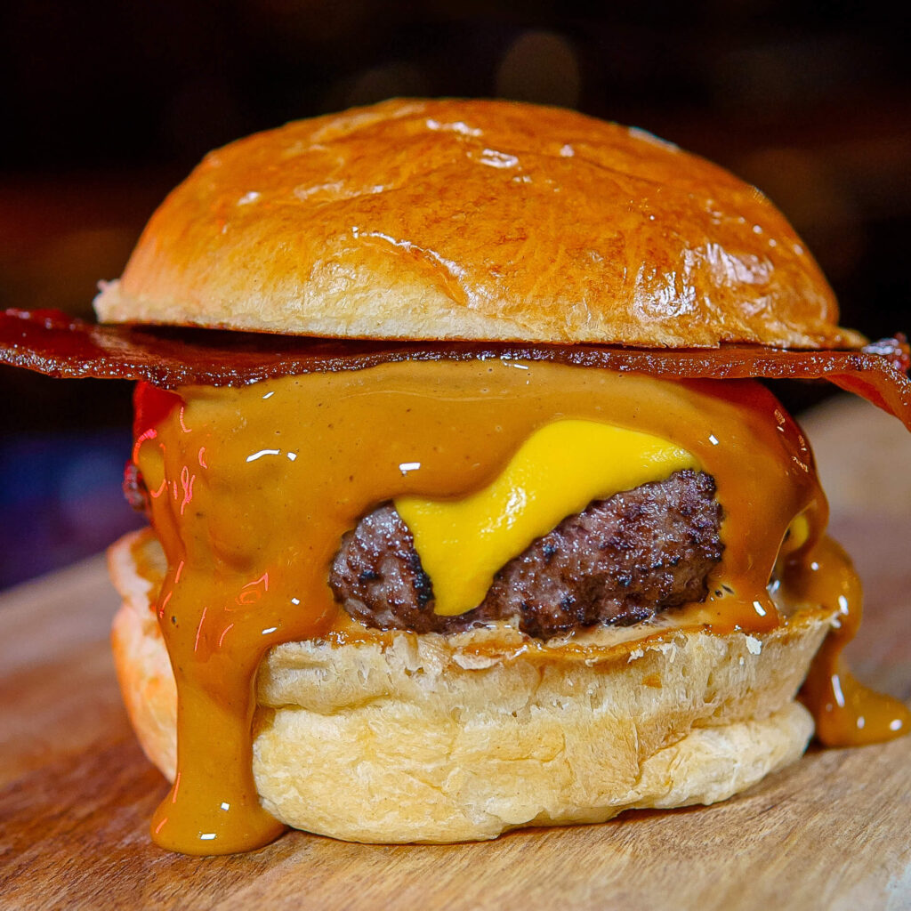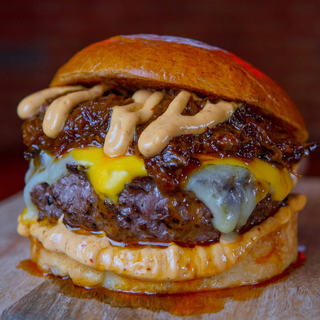 2 Patties de vaca gallega, doble queso cheddar americano, mermelada de bacon, cebolla crujiente, bacon y una espectacular combinación de salsas caseras: Mayo sriracha en la base del pan y sweet baconcoa en el pan superior (13.95€)