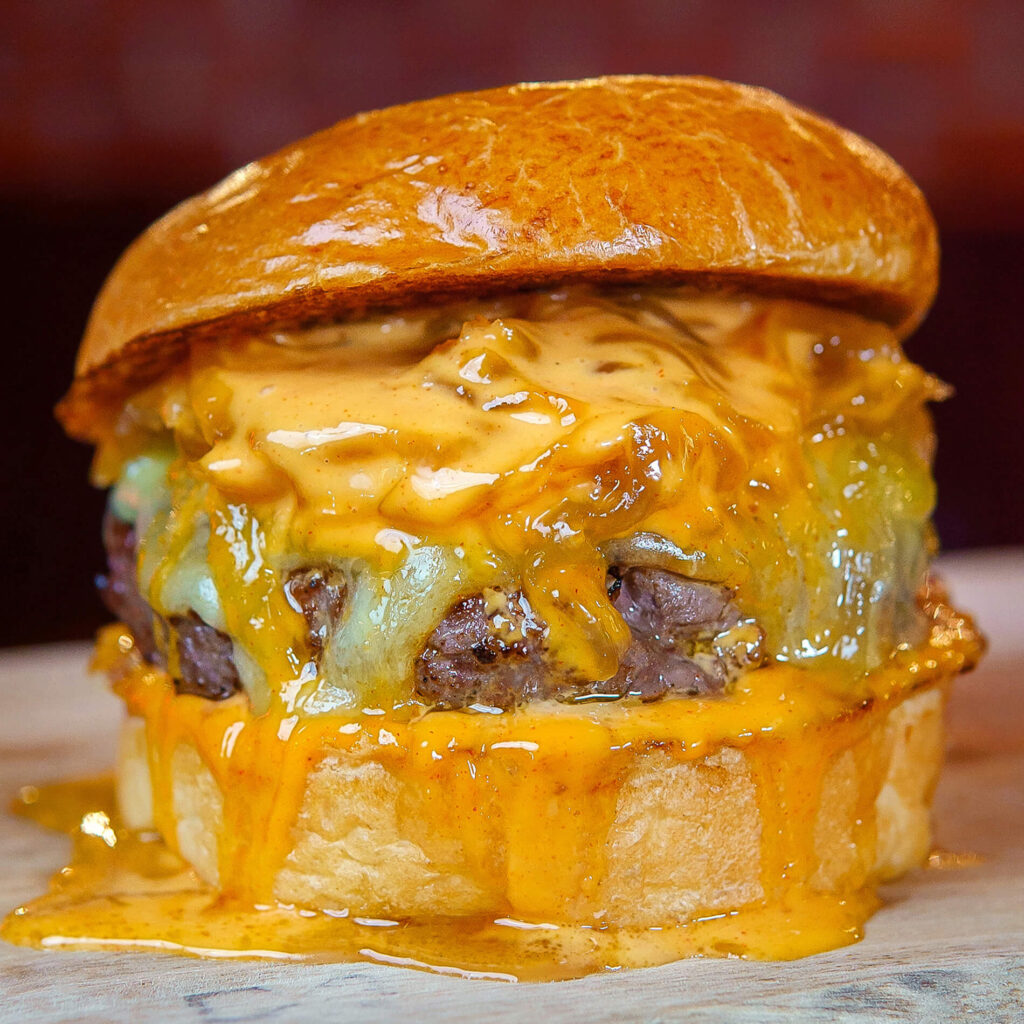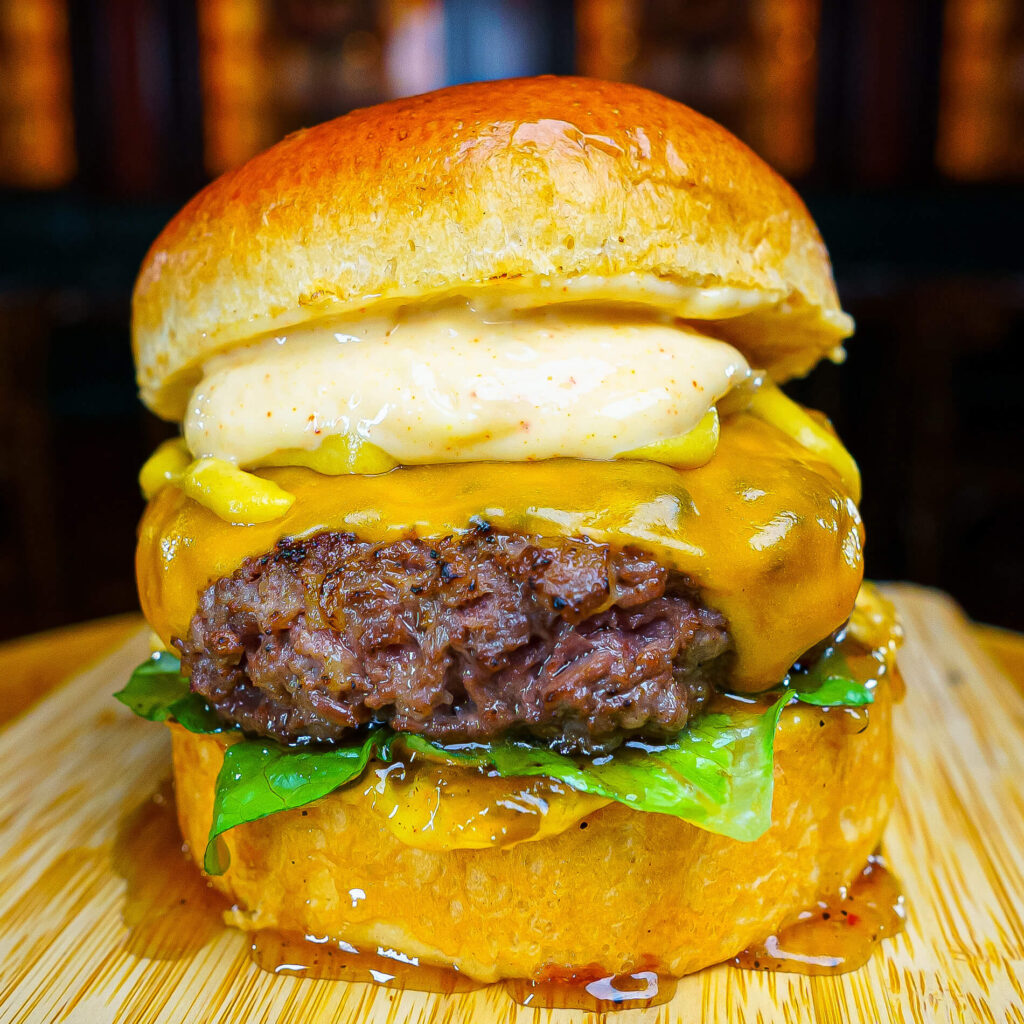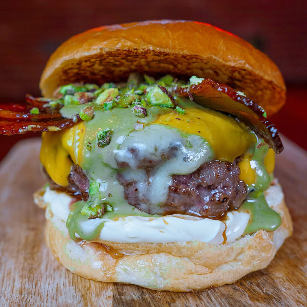 Burger de vaca rubia gallega madurada 45 días, queso cheddar ahumado, queso cheddar americano, doble bacon crujiente, mayonesa en la base del brioche y crema de pistacho italiana sobre la burger (14,5€)