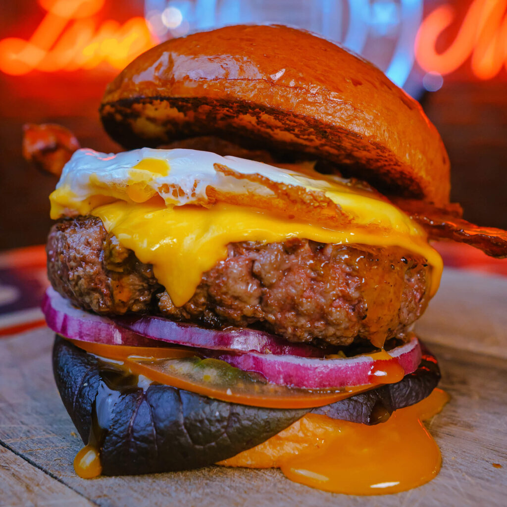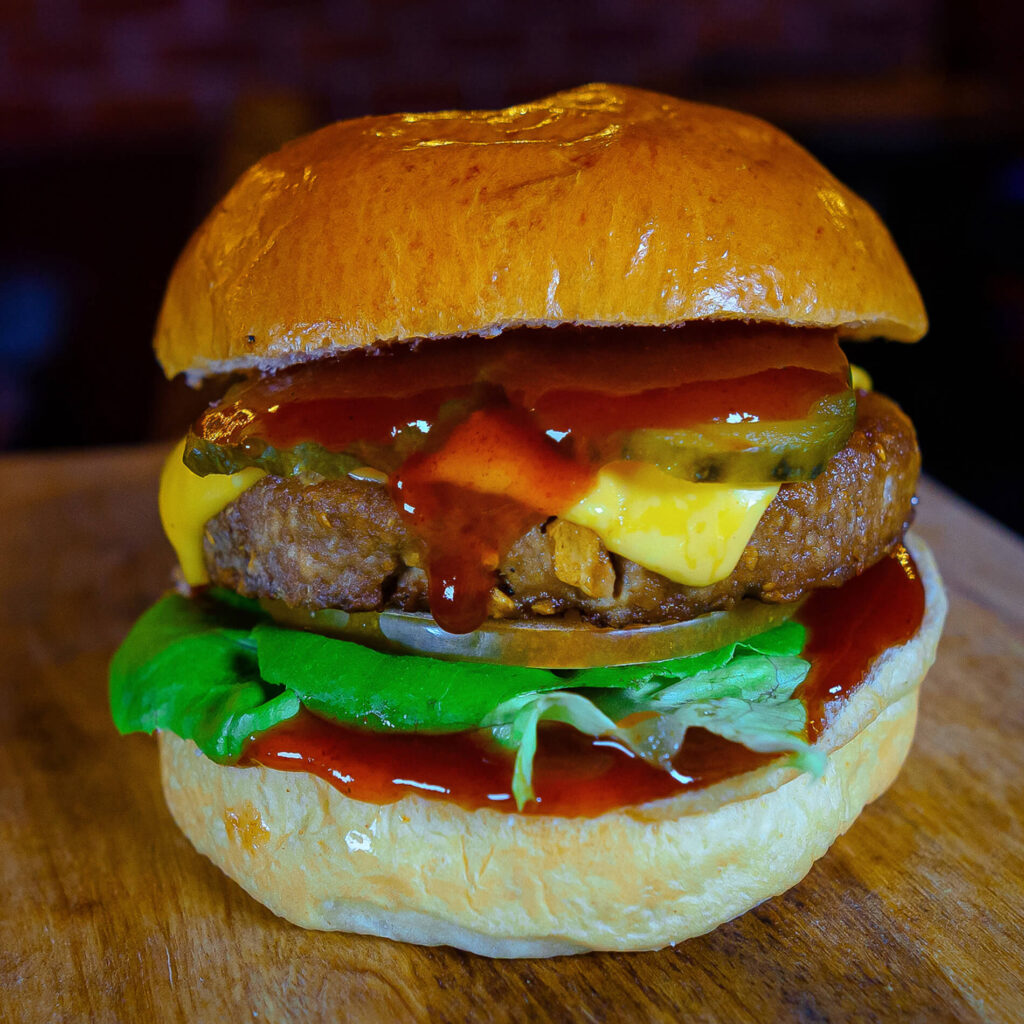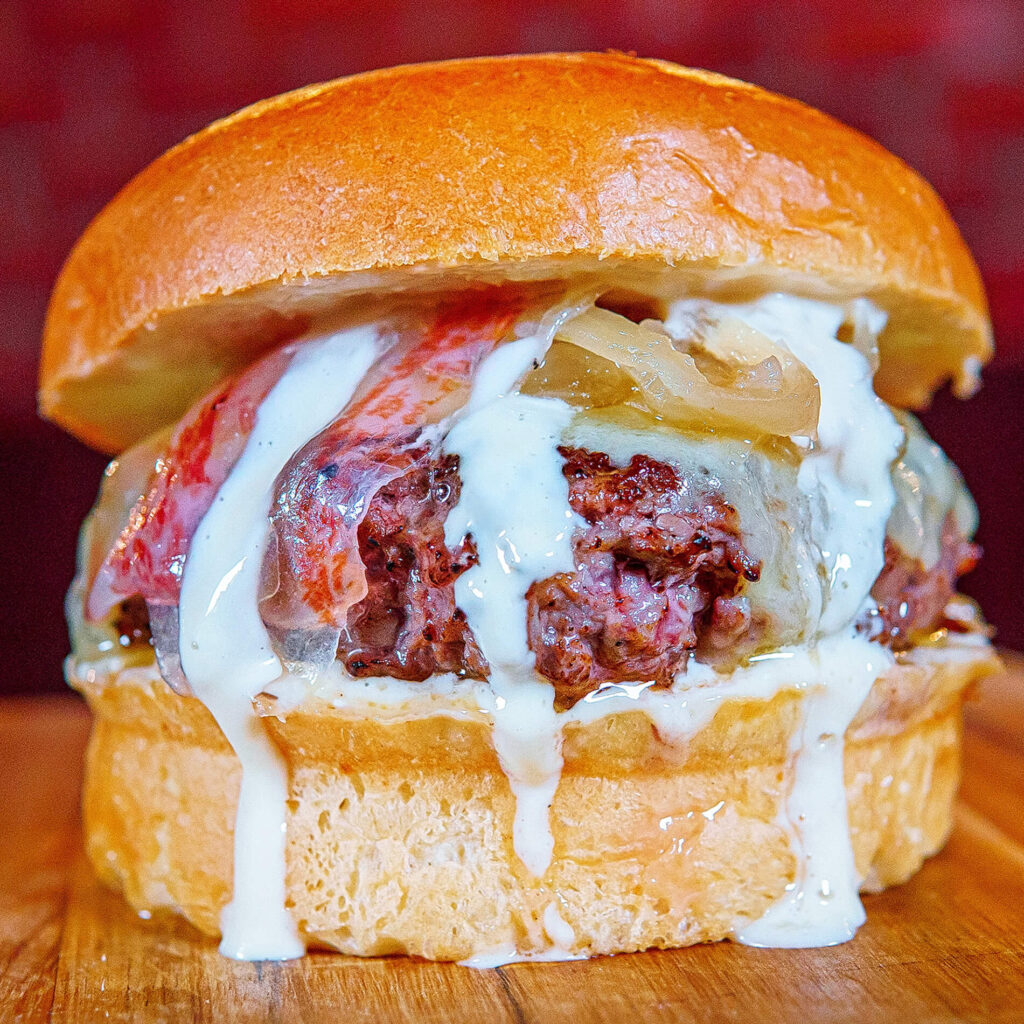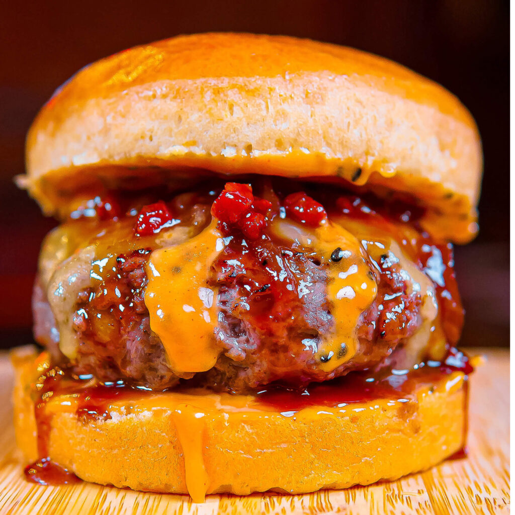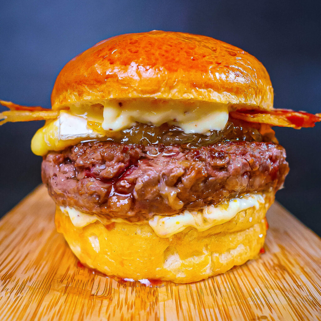 Mítica y brutal. Burger de vaca rubia gallega madurada 45 días, salsa coreana Gohujang, queso cheddar blanco curado y cebolla caramelizada (13,5€)