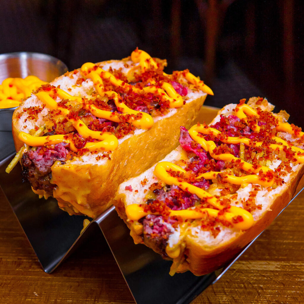 ¡Recién traída de EEUU! Carne de vaca rubia gallega madurada 45 días, queso cheddar ahumado, queso cheddar americano, costilla de ternera cocinada a baja temperatura durante 12 horas y desmigada. Para finalizar una espectacular combinación de salsas caseras: mayo-chipotle en ambos panes y sweet BBQ sobre la costilla (14,95€)