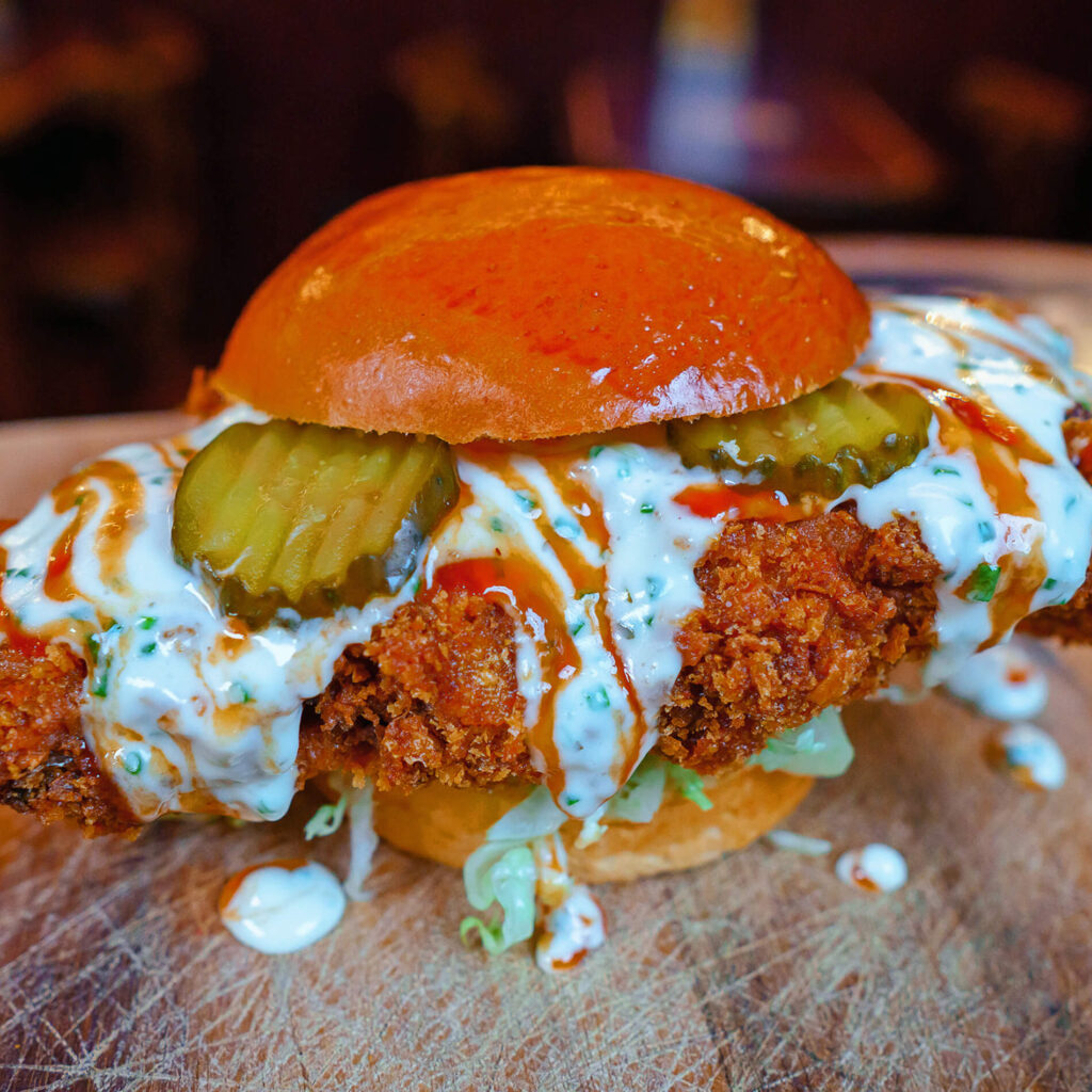Contramuslo de pollo marinado durante 24h y rebozado al estilo Kentucky, lechuga, pepinillos agridulces caseros y una espectacular combinación de salsa BM y mermelada de BBQ casera (12,5€)